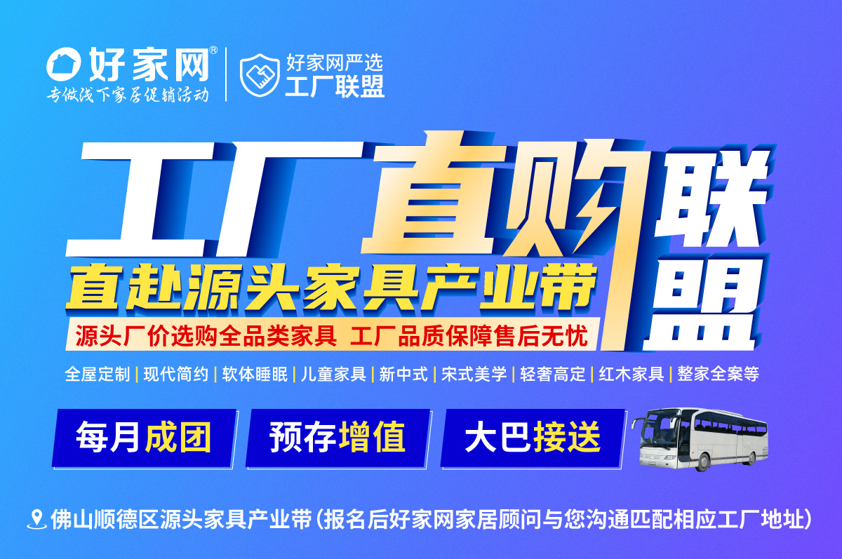 好家网严选工厂联盟,工厂直购品质保障、售后无忧,大巴来回接送,100元预存卡可增值至1000元,全品类各风格家具一应俱全,赶紧与亲戚朋友一起报名参加吧!
