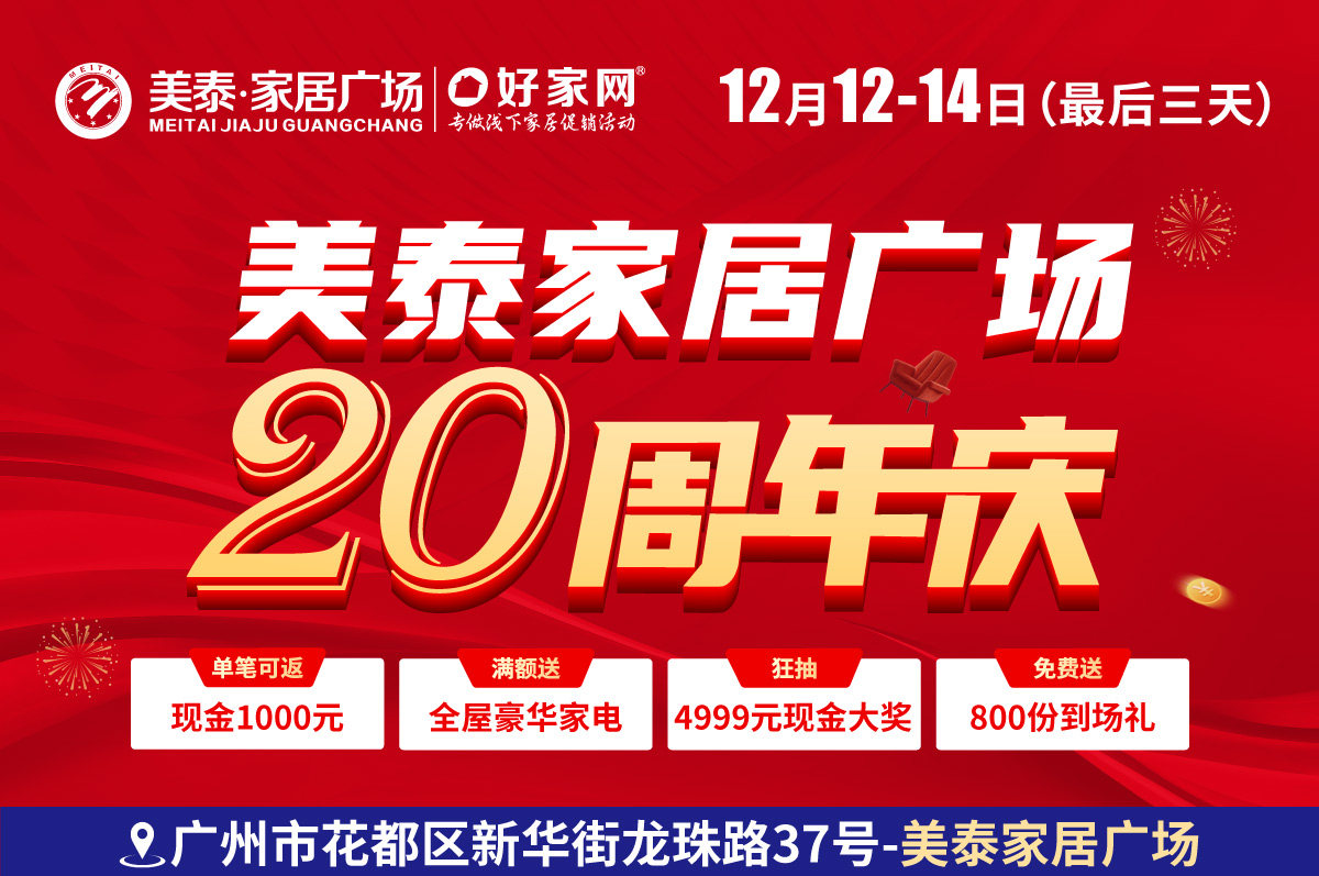 单笔可返现1000元,满额送全屋豪华家电,抽4999元现金大奖,派800份免费好礼,优惠尽在12月12-14日花都美泰家居广场20周年庆最后三天,请免费报名锁定优惠!